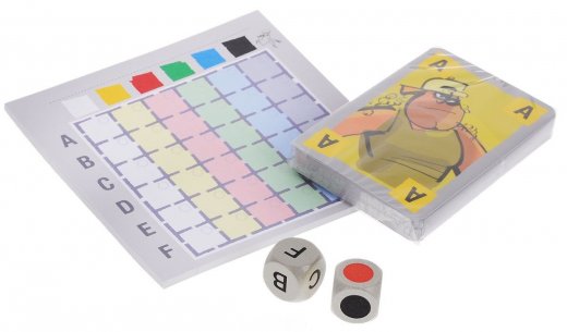 Состав: 36 карт жуликов, 1 кубик с гранями 6 разных цветов, 1 кубик с 6 разными буквами на гранях, 1 блокнот.
