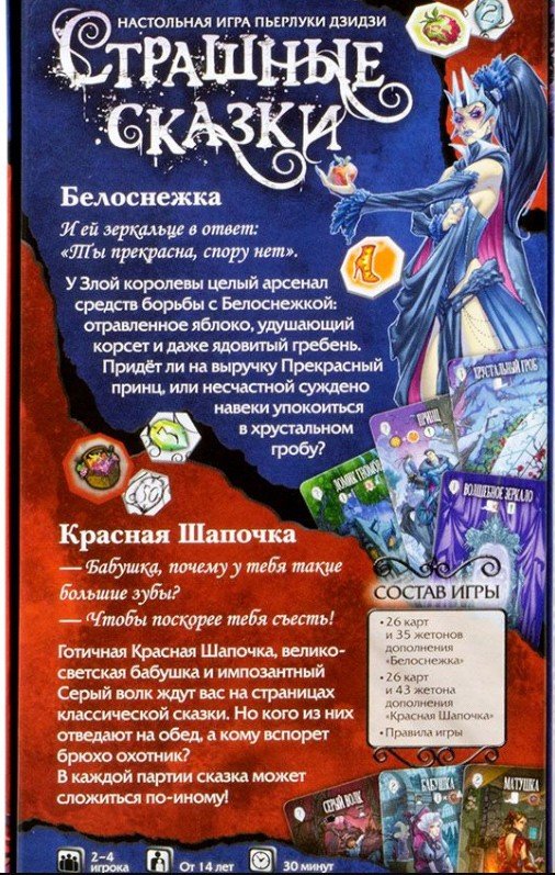 Внутри коробки вас ждет сразу два дополнения для базовой игры: Белоснежка и Красная Шапочка. Оба они совместимы с базовой колодой, можно взять любое на ваш вкус и замешать вместе с базой.