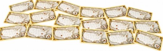 Состав: 1 карта Северной Америки (поле), 240 вагончиков, 5 маркеров подсчёта очков, 110 карт составов, 30 карт маршрутов, 5 памяток, 1 карта-бонус, правила игры.