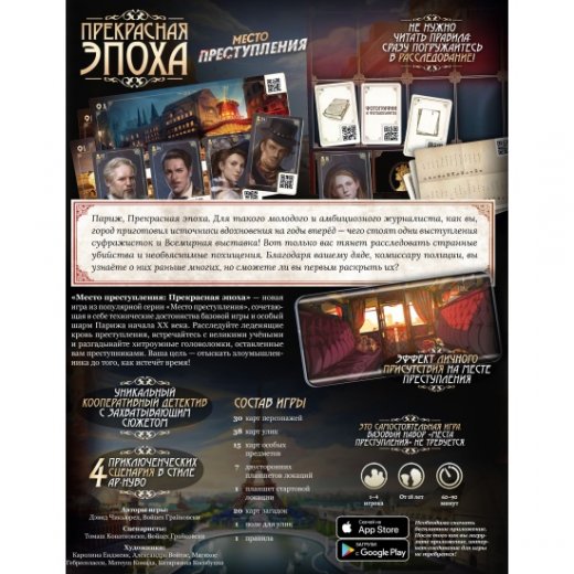 "Место преступления: Прекрасная эпоха" – это логическая настольная игра, являющаяся второй частью новой серии "Тысячелетие", которая повествует историю древнего рода Лавель из Парижа. Представители этой династии всегда славились своими особыми детективными навыками и сюжет этих игр связывает в единую эпопею приключения этих героев из разных эпох.