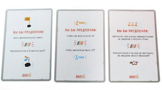 Принимают решение о выборе одного из вариантов. Дальше они прочитывают что на ней написано. Без озвучивания выбора.После этого все остальные участники игры по очереди объявляют, что бы они выбрали из двух предложенных вариантов (какими бы непривлекательными или, наоборот, равносильно приятными, они ни казались, выбор сделать придется) и аргументируют, почему. Ну а после того, как все, кроме первого игрока, высказались, начинается безжалостная и неукротимая бойня, которая может затянуться надолго.