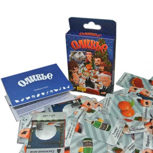 Настольная игра «Оливье» очень напоминает знаменитую карточную игру «Сундучки». Игроки стараются собрать у себя в руках желаемый комплект карт, получив при этом комбинацию рецептов новогодних блюд и предметов. Сложность заключается в том, что игроки постоянно сменяют свои карты и не знают какие им достанутся каждый раз.