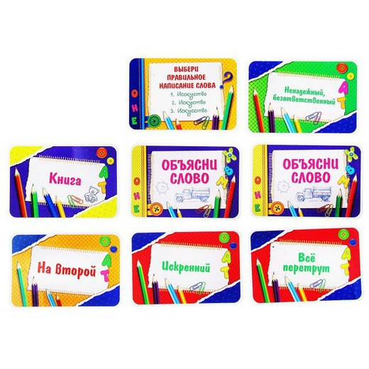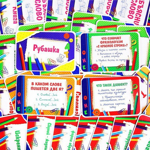 В коробке вы найдете карточки четырех уровней. На первых трех дан вопрос и три варианта ответа – ваша задача выбрать правильный; кто угадал – забирает карточку себе. В этом блоке собраны темы: «Правописание и произношение слов», «Словарный запас и происхождение слов» и «Что означает фразеологизм?». А на карточке четвертого уровня вам нужно будет не отгадать, а объяснить слово, используя только мимику и жесты. Тот, кто соберет наибольшее количество карточек, выигрывает!