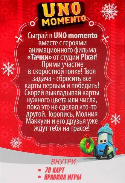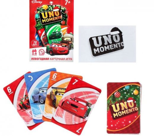 Сыграй в UNO momento вместе с героями анимационного фильма «Тачки» от студии «Pixar»! Прими участие в скоростной гонке! Выкладывайте карточки на скорость, обгоняйте соперников и стремитесь к победе.