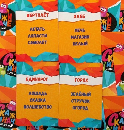 Вытягивайте карточки и устно объясняйте написанное на них. Но делайте это не так, как обычно! Во время игры нельзя использовать три слова, перечисленные на картинке. Всего в игре целых 100 карточек. Слова на них простые, так что будет интересно и взрослым, и детям.