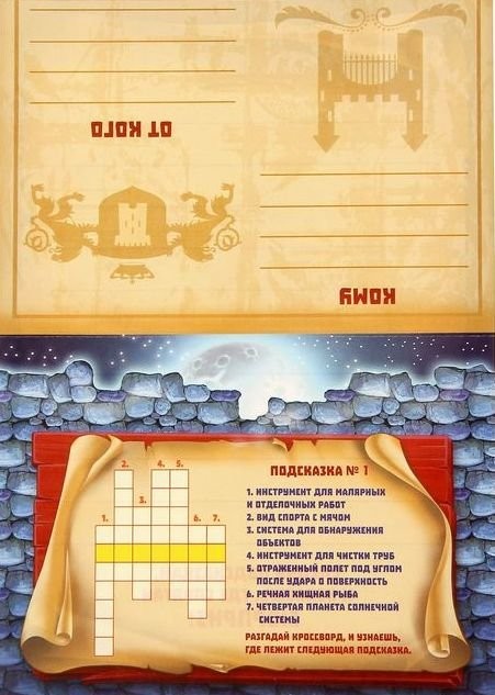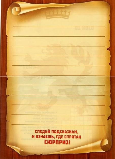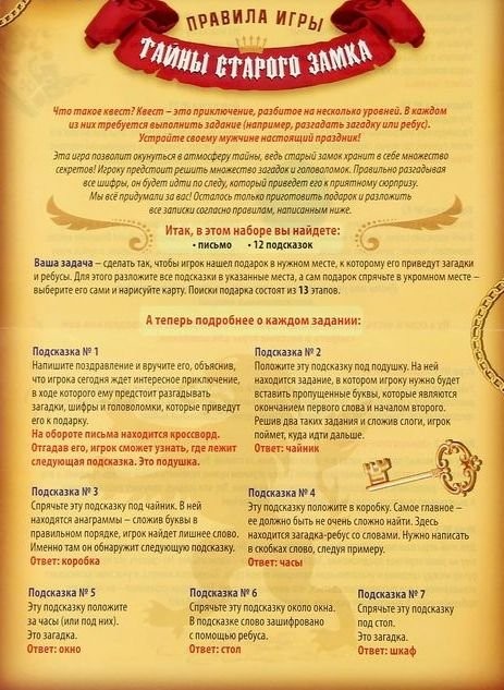 Просто подготовьте подарок, спрячьте его в квартире и разложите записки с подсказками в указанные места. Вручите игроку поздравительное письмо, и он будет идти по следу из шифров и головоломок, которые приведут его к сюрпризу!
