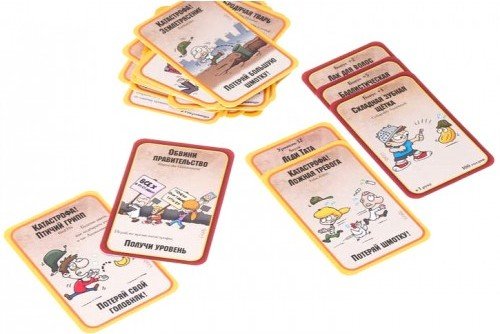 Состав: 92 карт дверей, 76 карт сокровищ, 12 карт сивyчатей, кyбик, правила игры.