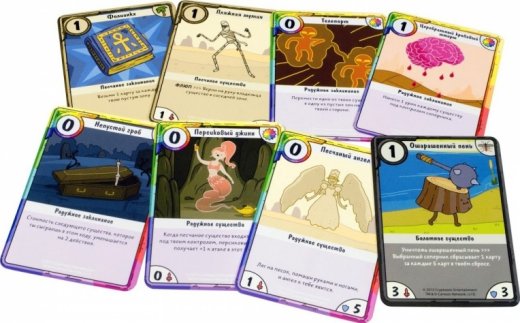 "Бимо против Леди Ливнерог" - это вторая самостоятельная игра, но можно смешивать с набором "Финн против Джейка". Собери собственную колоду, сразись с другом и выясни, кто из вас круче.