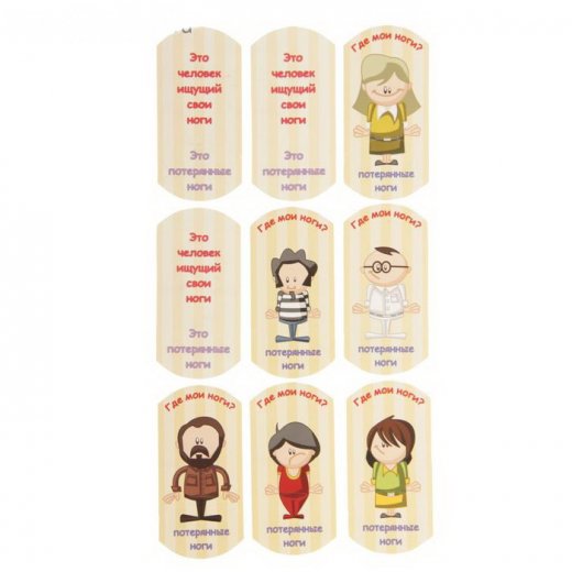 27 карт с различными персонажами, которые разделены на 2 части: туловище и ноги.