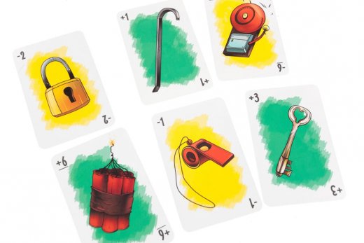 По желанию абсолютно все игроки могут сыграть с руки до двух карт, которые увеличат или уменьшат значение кубиков. Зеленые карты всевозможных полезных штуковин помогают увеличить свой куш, а желтые карты используются для того, чтобы помешать планам соперника во время его хода. Провернуть по-настоящему масштабное ограбление совсем в одиночку — задача почти нереальная. Поэтому огромным подспорьем окажутся специальные карты персонажей: тут и пронырливый Сообщник, ловко обчищающий карманы других игроков, и загадочная Леди, которая может оставить конкурента в дураках, и появляющийся в критический момент Полицейский…
