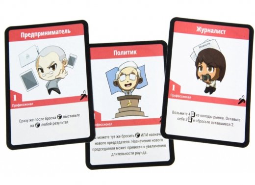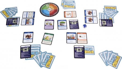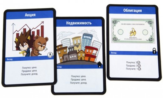 На столе выкладывается поле экономического цикла, сектора которого указывают на текущее состояние экономики в республике: Стагнация, Спад, Восстановление и Подъем. По внешней окружности указана шкала доходов от ваших вкладов, акций недвижимости и пр. На внутренней окружности указана шкала стоимости покупки/продажи акций недвижимости в тот или иной период экономического цикла. На текущее состояние экономики указывает специальный жетон, который каждый раунд будет менять свое положение, в зависимости от выпавшего значения на кубике производительности. Отдельно разместите стопки карт трастовых фондов и страховки – они будут доступны для покупки игроками, а оставшуюся колоду карт разместите на столе рубашкой вверх – это карты рынка. Игроки берут с рынка по 3 карты рубашкой вверх - это деньги, они лежат перед игроком, еще по 4 карты с рынка они берут себе в руку. С лицевой стороны – это уже карты Возможностей.