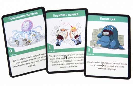 Состав: Двустороннее поле экономического цикла, 132 карты, 1 кубик продуктивности, 1 жетон экономики, правила игры.
