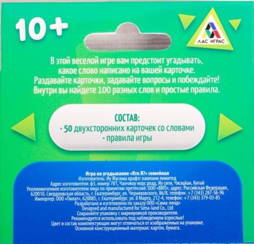Состав: 50 двухсторонних карточек со словами, правила игры.