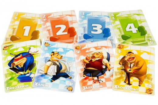 - Тихохрюн – до тех пор пока сыгравший эту карту игрок не выложит карту в следующий раз, все игроки должны сохранять полное молчание. Нарушитель тишины снимает запрет раньше положенного, но берёт на руку 2 карты из колоды.