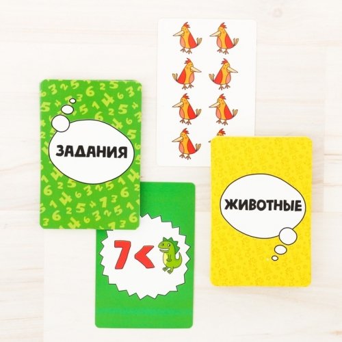 Участники одновременно переворачивают карточки с животными в своих колодах. На столе помимо зверей лежат ещё карты с заданиями.