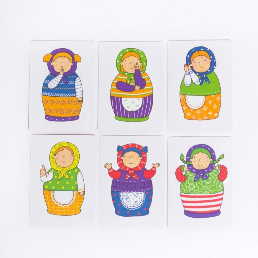 Найти матрешку в определенном наряде и повторить ее действие, например, наклонить голову или показать ладошки. Первый, кому это удалось, получает карточку в свою колоду. Побеждает в игре участник, собравший наибольшее количество карт.
