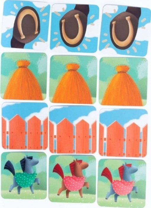 - Способствуем - размещаем 3 пони с общим свойством в загон или разбиваем подковой 2 карточки забора, или кладем в загон 1 сено.