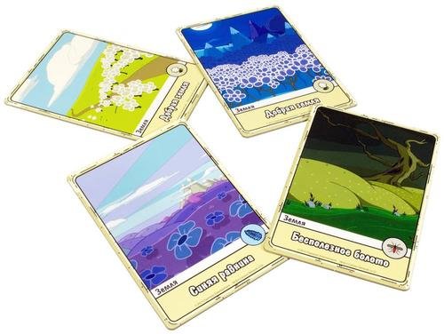 Игра проходит на специальном поле, которая выстраивается перед боем. Планшеты земель обоих игроков выкладываются друг напротив друга так, что получается поле 2х4 клетки. Карты земель одновременно являются ресурсами для оплаты карт и ячейками для выкладывания ваших существ или строений. Положение существ крайне важно, нападать друг на друга они могут только в том случае, если находят в одной области, то есть друг напротив друга. Это общее правило распространяется и на другие элементы игры.