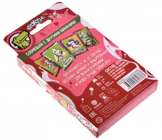 Тренировка мимики, жестов, риторики и искусства изображать предметы. Попробуете показать всем телом угар или нарисовать виагру? Кстати, коробочка игры такая маленькая, что можно носить её в рюкзаке или сумке постоянно, а в самый скучный момент вечеринки коварно доставать её ловким жестом. Таймер обычно используют на смартфоне, а рисовать можно и на салфетке (некоторые делают это с помощью планшета - очень экологично). 405 заданий - это на кучу оригинальных партий.