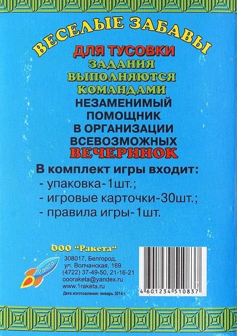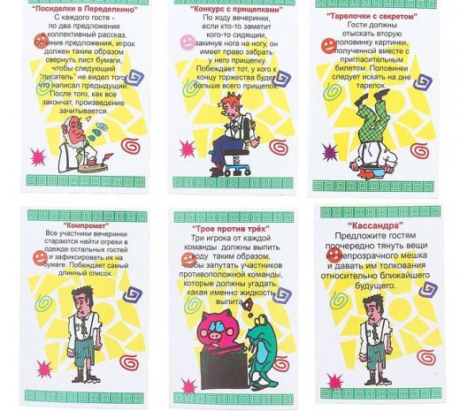 В комплект игры входят 30 карточек с веселыми заданиями, которые помогут в организации всевозможных вечеринок. С равным успехом игру можно использовать семейном торжестве или на корпоративной вечеринке. К имеющимся в игре заданиям Вы можете добавить свои. Фантазируйте, и Ваш праздник станет незабываемым.