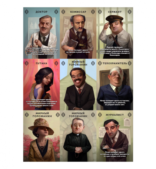 Разработчики изрядно потрудились, чтобы собрать в одной коробке только лучшее со всех возможных вариаций классической игры. Команда воспользовалась помощью искусного художника, который подарил каждой карте свой уникальный характер и привлекательный вид. В нем можно делать заметки и записывать подозрения участников. Тяжелое бремя ведущего стало намного легче благодаря блокноту. Принцип игры остается тем же. В случайном порядки участники получают карты ролей, на которых также есть подсказки и атмосферные иллюстрации в стиле криминальной Америки. Ночью мафиози убивают граждан, а днем начинается расследование. Каждый говорит свое мнение и старается доказать невиновность в убийствах, которые обрушились на улицы города.