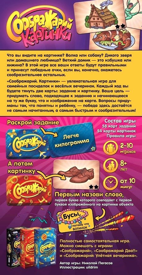 Старый добрый "Соображарий" меняет форму и содержание! Как быстро Вы сможете придумать слово, подходящее под изображение? Проверьте себя и своих друзей в новой увлекательной игре. Игра очень проста в освоении, динамична, подходит одновременно для детей и взрослых. В неё можно играть практически везде, взять её с собой также не составит никакого труда. Данная версия игры совместима с любыми играми в серии "Соображарий".