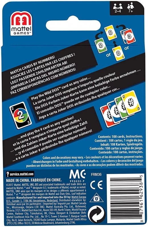 У UNO появился новый лучший друг — DOS! В этой веселой карточной игре два всегда лучше, чем один, и лучше всего — когда совпадают числа! Как и в UNO, цель игры DOS — первым сбросить все карты. В эту увлекательную игру для 2–4 игроков можно играть как командами, так и каждый сам за себя.