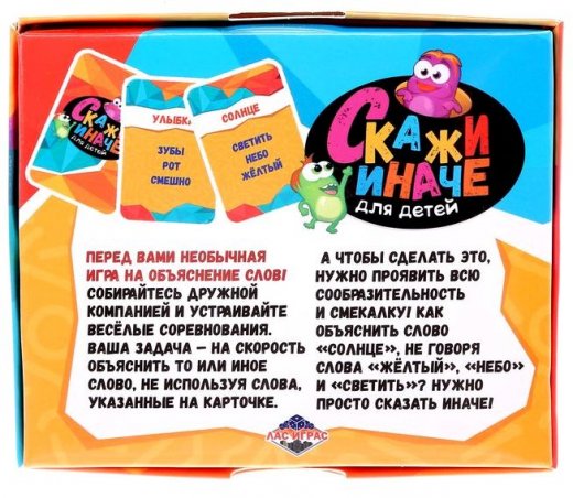 Вы готовы провести время весело и интересно? Тогда скорее начинайте играть! Думаете, что объяснить слово «солнце» легко? А что если при этом нельзя использовать «светить», «небо» и «жёлтый»? Испытайте свои силы в весёлой игре, скажите иначе, и это приведёт вас к победе!
