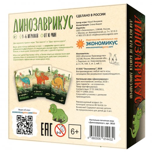 Игра для тех, кто не боится динозавров и умеет считать. Именно эти два навыка приведут к победе как в игре друг против друга, так и в борьбе против самой игры. Да-да, предусмотрено два режима, что позволяет играть и в одиночку, и компанией до 6 человек. Игроки участвуют в соревновании динозавров – задача не только победить в текущем раунде, но и хорошо подготовиться к следующему.