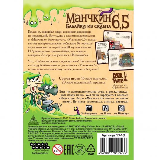 "Манчкин 6,5: Бабайки из склепа" – это небольшое дополнение, которое, однако, добавляет в игру новую механику и очень сильно расширяет игровой процесс! Оно похоже на "Манчкин 6. Безбашенные Подземелья" и является его логическим продолжением. Теперь в игре появляется новый формат карт – подземелья (в этой версии – склепы), которые лежат себе в сторонке и задают тон всему вашему приключению, ведь именно по этому данжену вы и будете передвигаться!