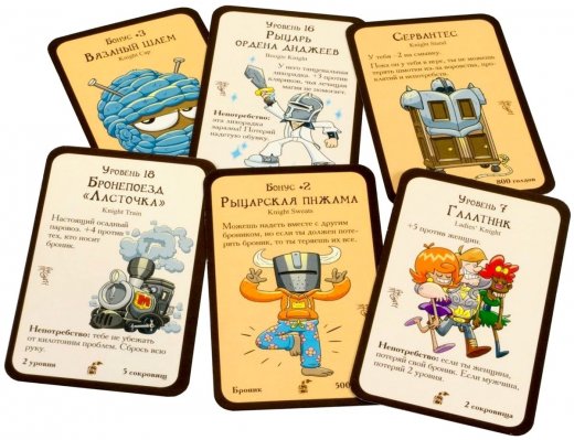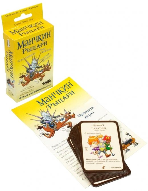 Внутри вы найдёте 15 новых карт – 11 карт дверей и 4 карты сокровищ. Рыцари ополчились на манчкинов, так что готовьтесь встретить новых монстров: "Галатника", "Бронепоезд Ласточку" или "Рыцаря ордена Диджеев". Без новых шмоток дело тоже не обойдётся, чего стоит хотя бы "Вязаный шлем"!