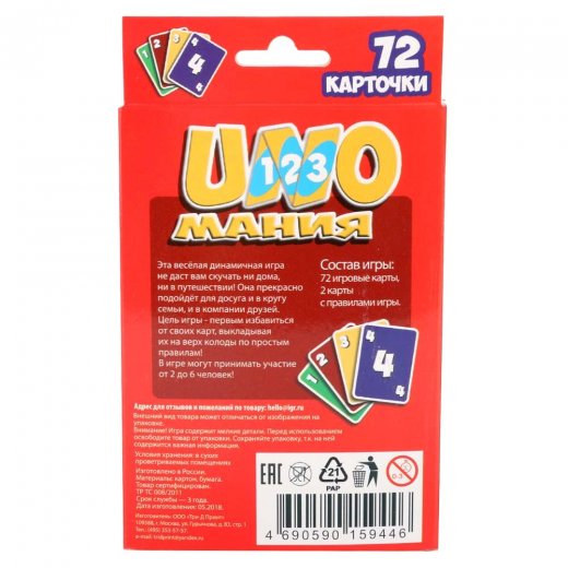 Купить настольную игру "UNOМАНИЯ 72 карточки" в Новосибирске Вы можете в магазине развивающих и настольных игр "Игры Почемучек".