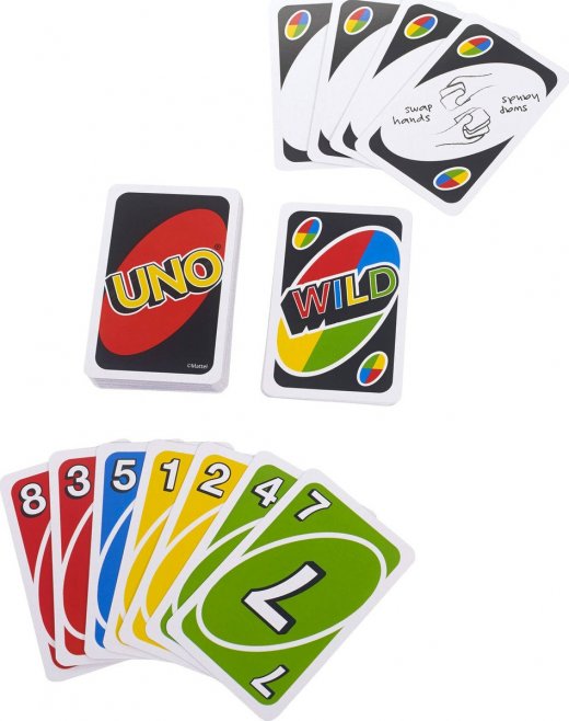 Очень просто! Нужно выложить карту с руки, но это можно сделать только в том случае, если она совпадает с сыгранной перед этим картой по масти или по достоинству. Например, если предыдущий игрок выложил десятку пик, вам следует сыграть либо десятку, либо пику, а если ни того, ни другого на руках нет, придётся взять карту из колоды. В Uno вместо мастей цвета, есть джокеры, которые можно выкладывать на любую масть и любое достоинство, и специальные карты с особыми свойствами (следующий игрок пропускает ход, направление игры меняется и т.п.). Кто быстрее избавится от всех своих карт, тот и выиграл. Благодаря простым правилам, нейтральной теме и небольшим размерам Uno стала одной из популярнейших настольных игр в мире!