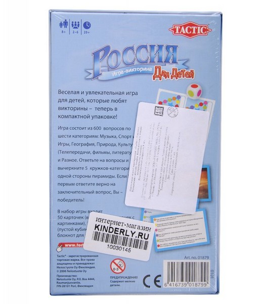 Настольная игра «Россия для детей» это карточная игра-викторина в которой соревнование приобретает обучающий характер. Из вопросов о России дети узнают новое. Не важно на сколько правильно ребёнок дал ответ, главное он запомнит верный вариант ответа после его прочтения и сможет воспользоваться им в дальнейшем.