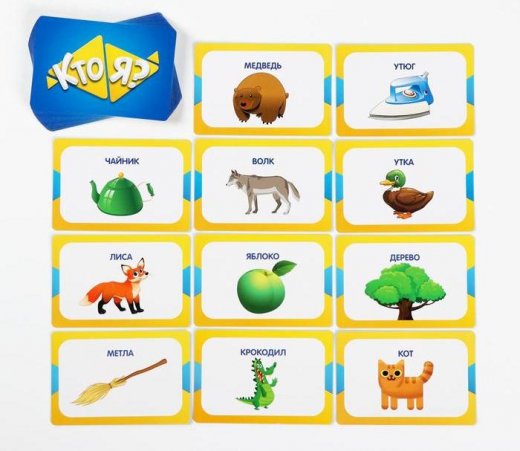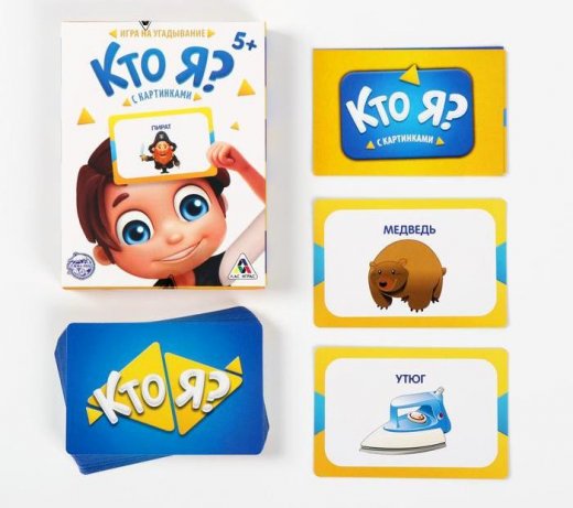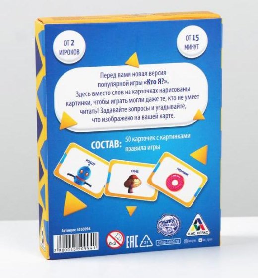 Перед вами новая версия популярной игры «Кто я?». Здесь вместо слов на карточках нарисованы картинки, чтобы играть могли даже те, кто не умеет читать! Задавайте вопросы и угадывайте, что изображено на вашей карте.