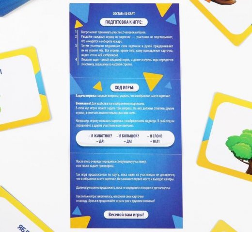 Задача: угадать, что написано на вашей карточке. А помогут вам в этом другие игроки. Каким образом? Задайте игрокам 3 вопроса, на которые они могут ответить «да» или «нет». Например: «Я — животное?», «Я ем траву?», «У меня есть рога?». Потом ходит следующий игрок.