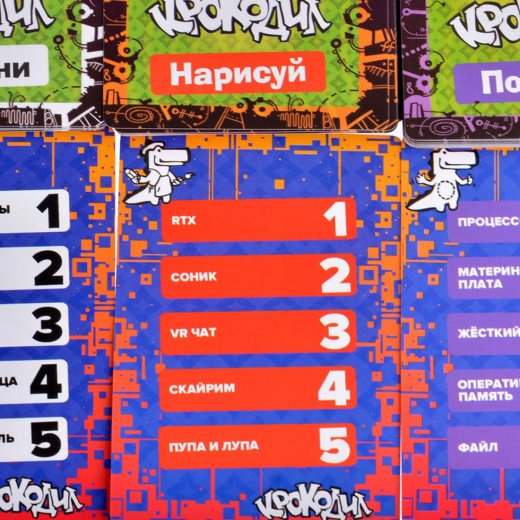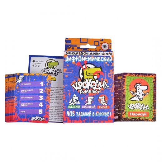 Настольная игра "Крокодил цифромемический" – это тематическая интерпретация знаменитой словесной игры для компании и вечеринок. Это компактная версия игры, которую удобно и легко можно взять с собой на природу или просто на прогулку с друзьями. Любые тематические "Крокодилы" могут быть смешаны между собой, что сделает игры ещё веселей, а ситуации комичней.