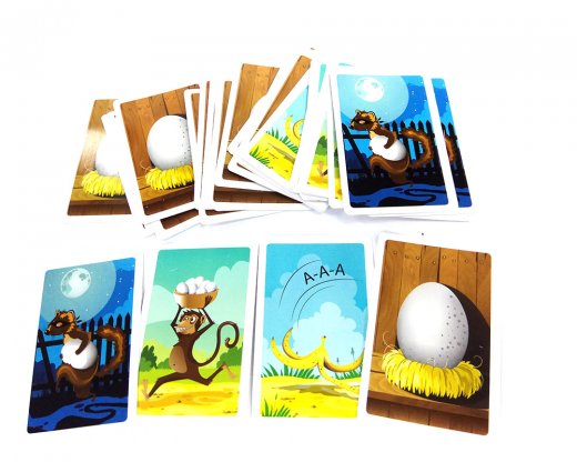Казалось бы, начал первым, значит, точно выиграешь. Ан нет! Другие игроки будут всячески мешать, посылая к вам то куницу, то обезьяну. Куница может утащить только 1 яйцо, в то время, как обезьяна все, что есть у игрока. В игре есть карты оружия: банановая кожура. Она эффективно применяется против обезьяны: если обезьяну направили к вам, то скорее кидайте ей под ноги банановую кожуру - противник лишится обезьяны, а вы сохраните собранное. Если же мимо вас обезьяна будет нести украденное у соседа, то можно кинуть ей банановую кожуру, чтобы разбить украденные яйца. Карту банановой кожуры также можно разыграть на противника в тот момент, когда он кладет карту яйца из руки. Ход сделан, но в лотке не прибавилось! На куницу кожура не действует - очень уж ловкие воришки.
