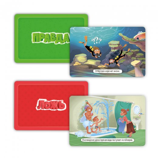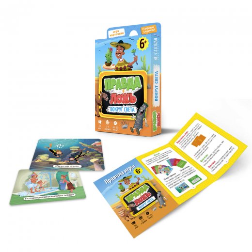 Вокруг света- популярная тематика серии карточных игр "Правда-ложь"! Супер-интересные факты о разных странах, их особенностях и жителях, красочно изображенные на карточках, расширят кругозор ребенка в игровой форме! Игрокам предстоит разобраться, что из них правда, а что- ложь! 50 карточек с ярчайшими фактами и 10 карточек игроков не оставят равнодушными ни детей, ни взрослых.