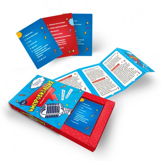 Карточная игра "Импровизация" - это совершенно новый формат карточной игры с захватывающим сюжетом! Механика игры построена на заданиях, разделенных на 7 раундов! Каждый игрок откроет в себе актёрский талант и станет мастером импровизации! "Объяснить слова без слов", "угадать смысл неизвестных понятий", "читать по губам" - только часть увлекательных заданий в борьбе за звание Великого импровизатора!