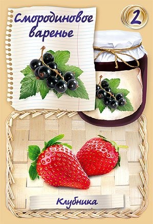 Каждая карта, используемая в игре, поделена на две части: верхнюю и нижнюю. В нижней части карты изображен ИНГРЕДИЕНТ – это ягода или фрукт, из которого можно сварить соответствующее варенье. В верхней части указан РЕЦЕПТ, приведено его наименование и указано, сколько очков он приносит игроку. Рецепты бывают трёх видов: