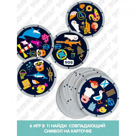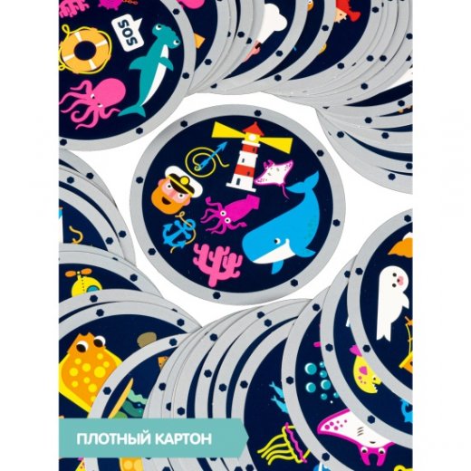 Перед началом каждой игры внимательно рассмотрите все изображения на игровых карточках. Карточки круглые и имитируют иллюминатор. Весь подводный мир и всё, что связано с подводными путешествиями, отражено в изображениях на карточках. В дальнейшем будем называть их символами. Примеры символов вы найдёте в инструкции. На каждой карточке 8 символов, и есть ровно один совпадающий символ. Его и нужно найти. Ни одна из карточек не повторяется.