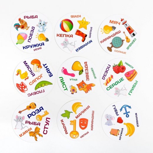 Игроки ищут следующие совпадения: 2 одинаковые слова, 2 одинаковые картинки, картинка и слово, которое является названием картинки.