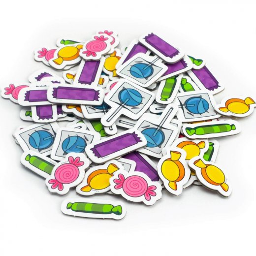В комплекте: "Персонажи" 26 карт, 60 жетонов конфет, 4 жетона арбузов-фонарей, "Конфеты" 40 карт, инструкция.