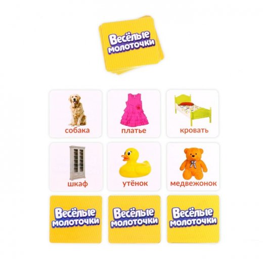 Разложите большие карточки на столе картинками вверх, возьмите по одному молоточку. На каждой из карточек есть картинка одной из 6 тем: одежда, игрушки, еда, фрукты, животные или мебель.