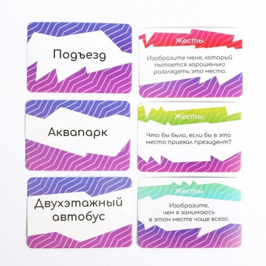 В этой игре важно угадать не персонажа, а место действия. В этом вам помогут наши карточки с вопросами, ответ на которые можно дать только с помощью мимики и жестов. Вам предстоит отгадывать не персонажей, а место, в котором вы находитесь. Просто тяните вопросы, задавайте их соперникам и отгадывайте, что вам показывают другие игроки. А победит тот, кто первым отгадает слово на своей карте!