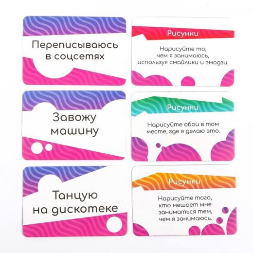 В этой игре важно угадать не персонажа и не место — важно изобразить действие. В этом вам помогут наши карточки с вопросами, ответ на которые можно дать только с помощью рисунка. Вам предстоит отгадывать не персонажей, а разного рода действия (занятия). Просто тяните вопросы, задавайте их соперникам и отгадывайте, что вам нарисовали другие игроки. А победит тот, кто первым отгадает слово на своей карте!