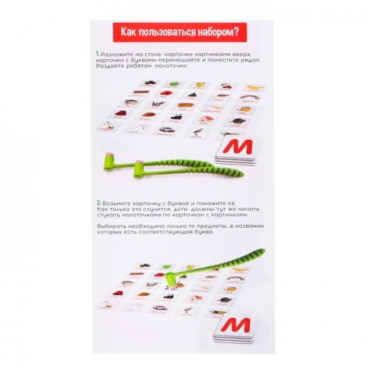 3. Участники начинают стучать молоточками по карточкам с картинками. Нужно найти карточки с предметами, в названии которых есть соответствующая буква.