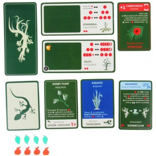 Они будут плодоносить, разрастаться и приобретать новые свойства. Всё как в жизни: например, если растение слишком разрослось (накопило слишком много жетонов еды), в следующую фазу роста оно потеряет лишние жетоны — вовремя надо морковку прореживать! В наборе есть ещё и хищные растения, которые могут нападать на ваших зверей в ответ на желание сорвать с них веточку. А ещё этими растениями можно друг в друга кидаться — вот это подстава, они наносят такой же урон, как обычный хищник.