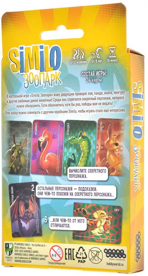 Кооперативная настольная игра «Similo: Зоопарк» проверит вашу дедукцию и умение мыслить логически. На столе 12 карт, впереди 5 раундов и только один секретный персонаж, которого вы должны угадать. Но один из вас знает, какой персонаж искомый, и этот игрок должен помочь остальным отыскать его. Помощь игрокам заключается в выкладывании карт с руки: если карта разыграна вертикально, значит у искомого персонажа есть с ней что-то общее, а если горизонтально, то наоборот. Остальные игроки после каждой разыгранной карты вместе решают, какую, или даже какие карты они хотят убрать. Когда на столе не останется ни одной карты, кроме искомой, вы побеждаете! Но если вы решите выкинуть её – вам тут же засчитается поражение.